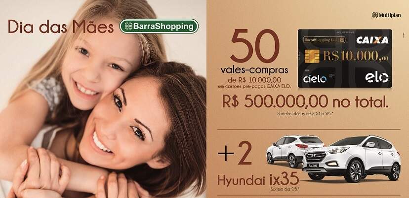 Até o dia 08 de maio, o complexo BarraShopping e New York City Center realiza a sua promoção de Dia das Mães. A cada R$500 em compras, os clientes poderão trocar por um cupom e concorrer ao sorteio diário de cinco vales-presentes no valor de R$ 10 mil cada para serem usados nas lojas do complexo.