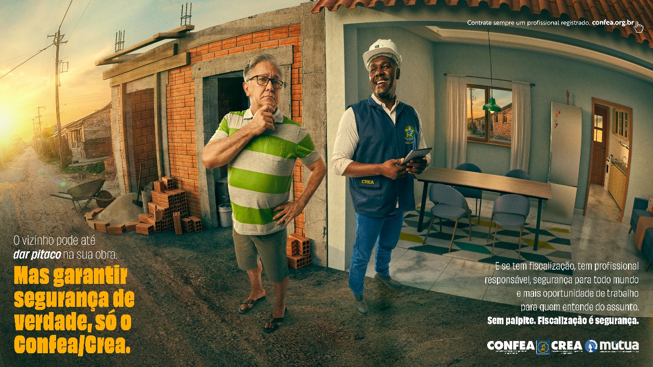 Com 60” e uma versão de 30”, o filme tem uma pegada bem-humorada, leve e, até mesmo, cômica, e conta com a presença de um narrador que também compõe a cena, junto com outros personagens ao fundo do cenário. Dessa forma, o filme apresenta o Sr. Anísio, mestre da fiscalização não oficial, que olha por cima da tela do celular, para vigiar que acontece na rua, o quintal da vizinha e por aí vai. Nosso narrador também apresenta o Henrique, que também fiscaliza. Mas dessa fiscalização todo mundo precisa, porque em vez de palpites, ele garante a presença de um engenheiro registrado onde é necessário. Assim como nos filmes, outras peças da campanha reforçam as mensagens de que se a fiscalização, além de garantir a presença de um profissional responsável e mais segurança para todos, também valoriza e protege o mercado de trabalho, combatendo a prática ilegal no setor da engenharia.