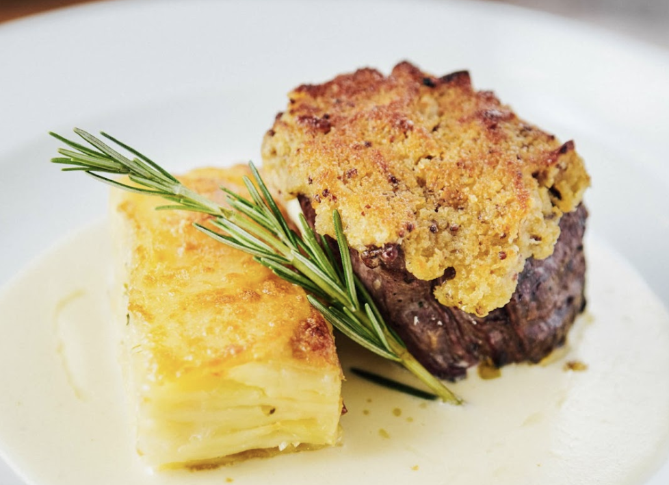 No cardápio: Filé com crosta de Parmesão Reserva Faixa Azul, acompanhado de Gateau de Batatas e Fonduta de Gorgonzola Faixa Azul.