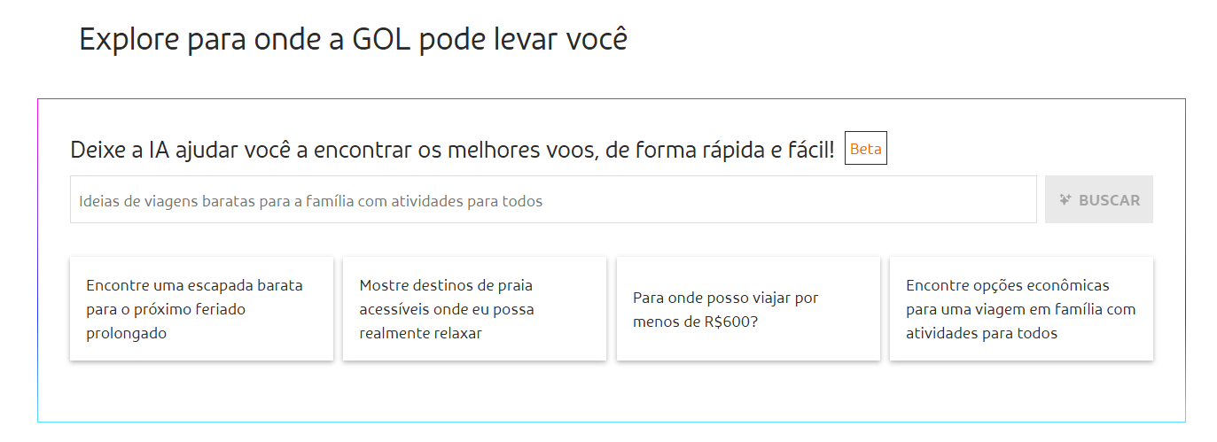 “A GOL foi a companhia que democratizou a aviação no Brasil, e fez isso de forma simples, humana e inteligente. O pioneirismo em oferecer check-in digital, o Wi-fi a bordo para entretenimento e o sistema de acompanhamento do voo em tempo real são exemplos de soluções que destacam a inteligência do nosso negócio para seguir encantando e fidelizando nossos clientes. Essa é a mensagem que buscamos potencializar nesse novo momento”, afirma Patrícia Pessoa, Diretora de Marketing da GOL. Tangibilizando o conceito para o público, junto com a campanha a GOL trouxe como inovação a implementação de inteligência artificial na busca de seu site, sendo a primeira companhia aérea das Américas a oferecer a solução. A proposta é ajudar clientes a encontrarem a melhor oportunidade de viagem para suas necessidades, podendo buscar, por exemplo, voos para locais onde está calor dentro do orçamento e do período pré-estabelecido. A plataforma entrega ainda dicas de roteiro para cada destino. “Na GOL, colocamos o Cliente no centro das nossas decisões, olhando para sua jornada conosco desde o momento que ele está imaginando a próxima viagem. Realizamos estudos aprofundados sobre a maneira que o consumidor busca passagens e, como resultado, trouxemos a possibilidade de busca atrelada a inteligência artificial, que vai facilitar muito a tomada de decisão das pessoas”, afirma Patrícia Pessoa, Diretora de Marketing da GOL. |