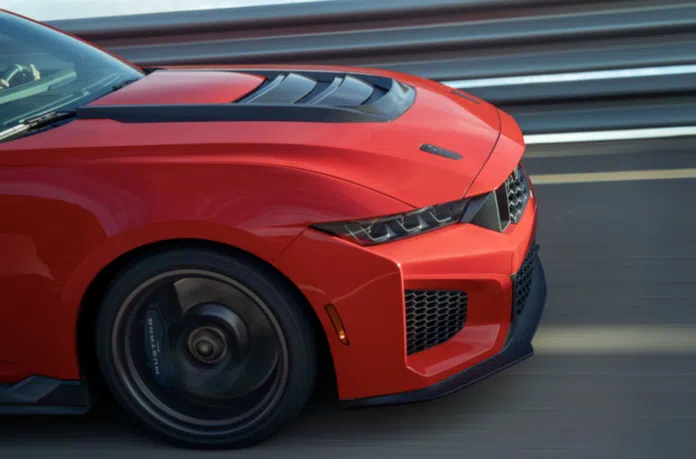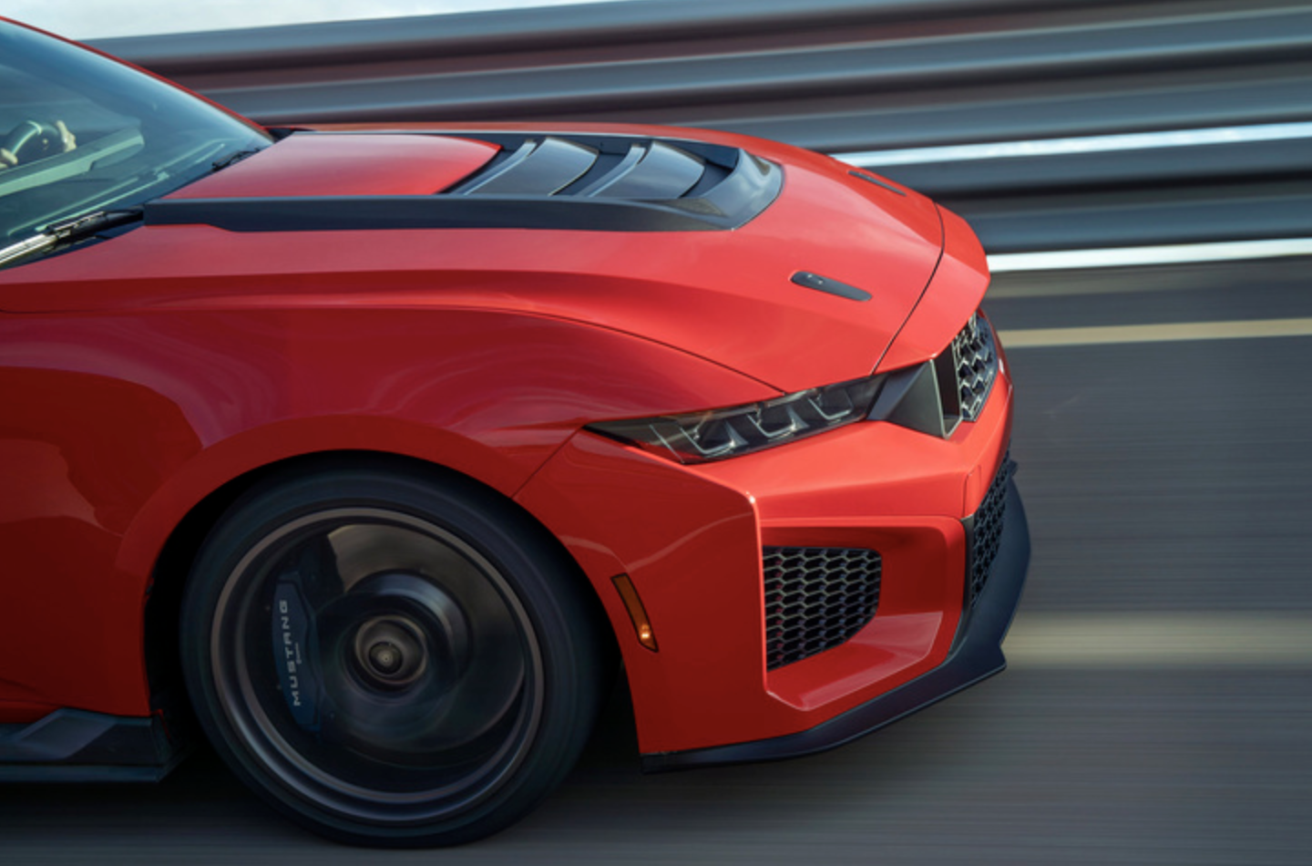 A resistência na pista foi um objetivo principal no desenvolvimento do Mustang Dark Horse SC. A equipe de design trabalhou para gerenciar o arrefecimento e a função aerodinâmica refinando a forma icônica do Mustang.