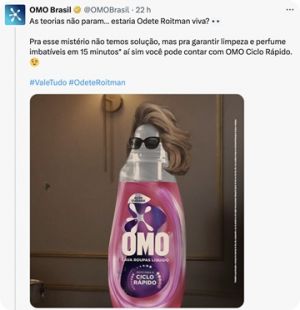 Mas a marca não parou por aí. Em um dos momentos mais aguardados da trama, a famosa morte de Odete Roitman, OMO encontrou uma forma divertida e contextual de estar presente. A marca foi a única a criar um break totalmente integrado à narrativa, exibido logo após a cena. No comercial, dois colaboradores fictícios da produção da novela comentavam sobre o desafio de lavar, com rapidez, os 5 figurinos usados na gravação, algo que só foi possível graças ao novo OMO Ciclo Rápido.