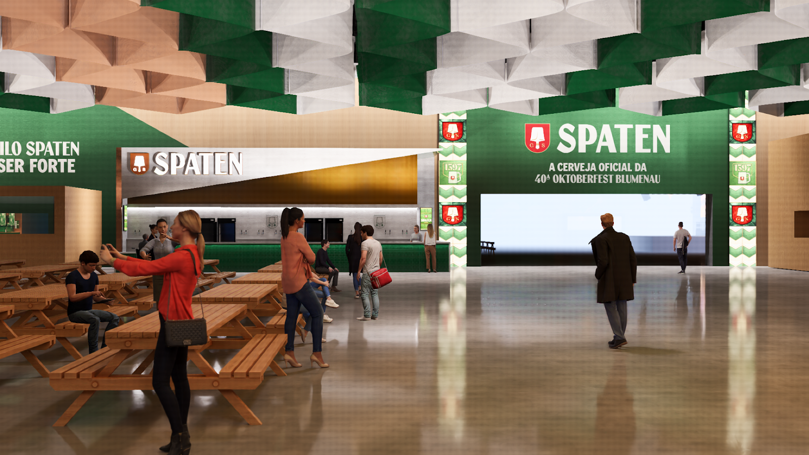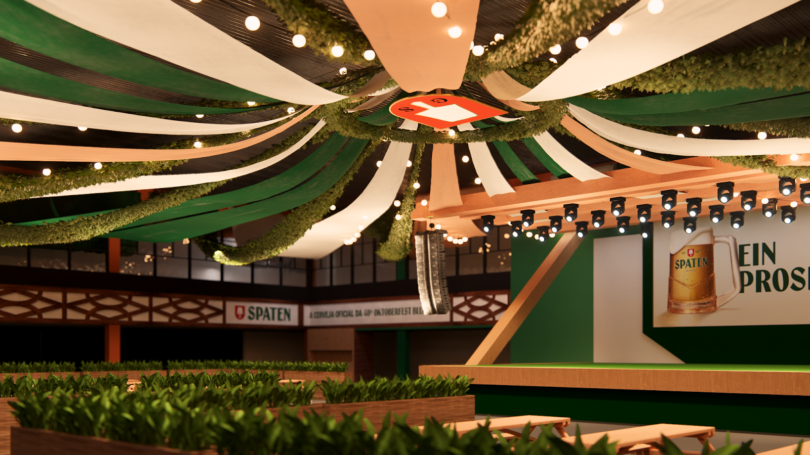 Espaço que homenageia os 40 anos da Oktoberfest de Blumenau, com paredes ilustradas por pontos turísticos estilizados da cidade, todos com a identidade da marca e traços do artista Victor Beuren, responsável pelo cartaz oficial deste ano. A cenografia também carrega uma estética fiel à identidade visual da Spaten, celebrando a história e o legado da festa.