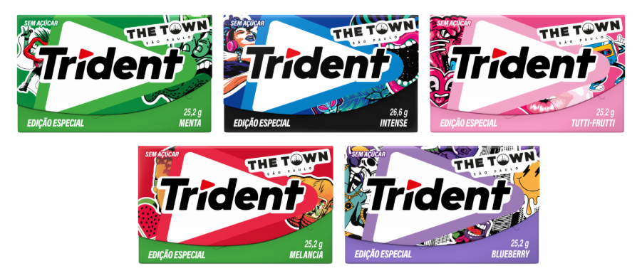 Para celebrar o The Town 2025, Trident apresenta embalagens temáticas limitadas, cada uma representando um gênero musical: Rock (menta), Trap (blueberry), Funk (melancia), Eletrônico (intense) e Pop (tutti frutti). Disponíveis em pontos de venda de todo o Brasil, elas são parte da estratégia para conectar a marca a universos que inspiram a Geração Z: música, moda e cultura pop.