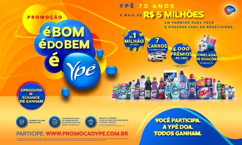 A Ypê, empresa brasileira de produtos de limpeza e higiene, iniciará sua maior promoção do ano: ‘É Bom. É do Bem. É Ypê’, que contemplará com 1 milhão de reais o ganhador final, além de sete carros e quatro mil vouchers no valor de R$ 1.000,00 cada para os consumidores que adquirirem produtos Ypê nas redes aderentes à campanha. Serão 14 semanas de promoção, a partir de 24/08, segunda-feira.