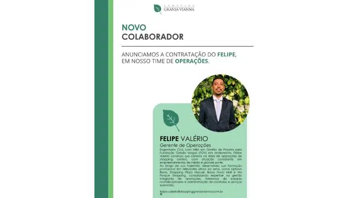 Engenheiro civil, Felipe Valério construiu sua carreira no setor de shopping centers, liderando a área de Operações em empreendimentos de médio e grande porte, consolidando sua expertise na gestão integrada de operações, liderança de equipes e administração de contratos e serviços essenciais. O executivo atuou também no Bossa Nova Mall e no Via Parque Shopping, shopping center que integram o grupo Alqia no Rio de Janeiro, e chega ao Granja Vianna com o compromisso de fortalecer o empreendimento da Alqia como um endereço completo para compras, serviços e lazer, promovendo experiências relevantes inovadoras para a região.