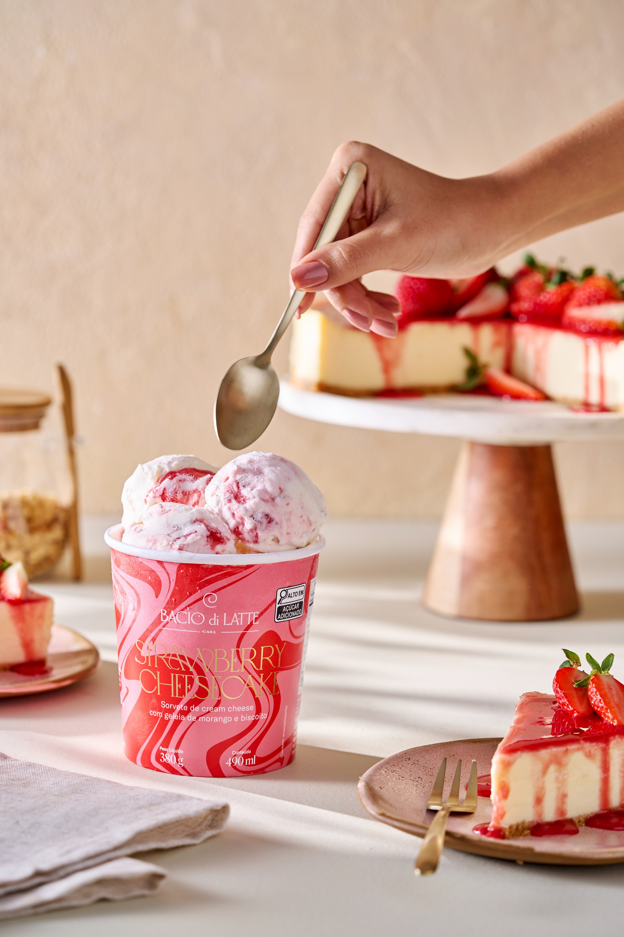 Já o Bacio Casa Strawberry Cheesecake harmoniza gelato de cream cheese, calda com pedacinhos de morango e crumble amanteigado crocante. O novo sabor se junta aos 10 outros da linha Bacio Casa, que incentiva a versatilidade e consumo no conforto do lar.