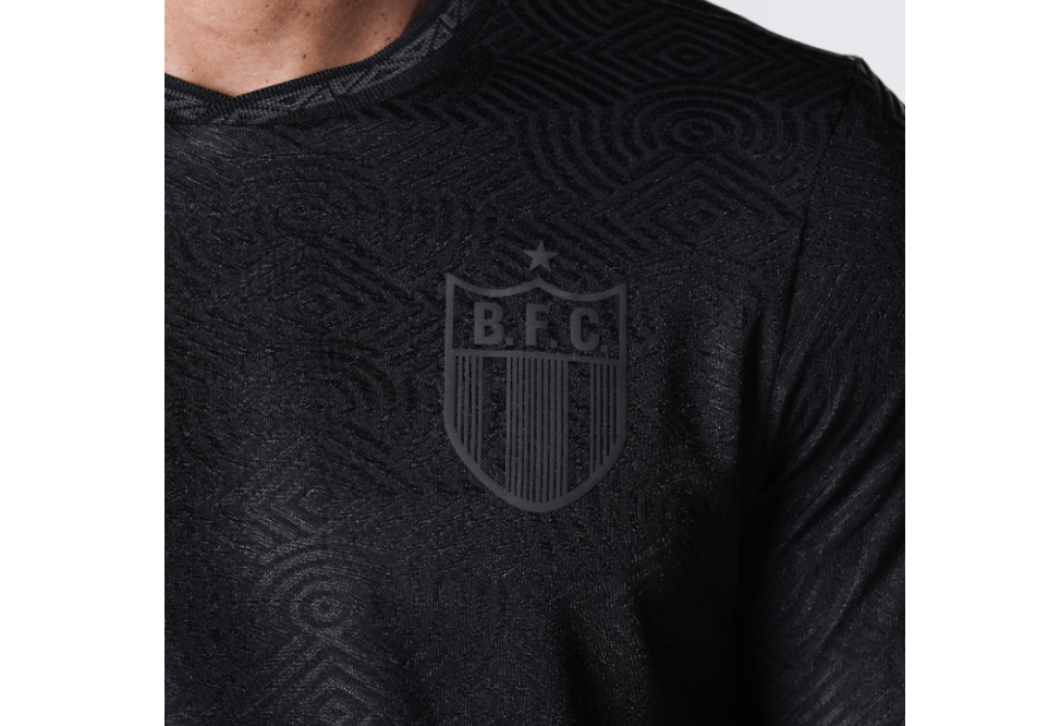 Com um design elegante e imponente, a camisa adota o conceito “All Black”, no qual o preto domina toda a composição, do escudo aos detalhes gráficos em relevo. A textura do tecido traz formas geométricas inspiradas em símbolos de origem africana, representando a luta por igualdade dentro e fora dos gramados.