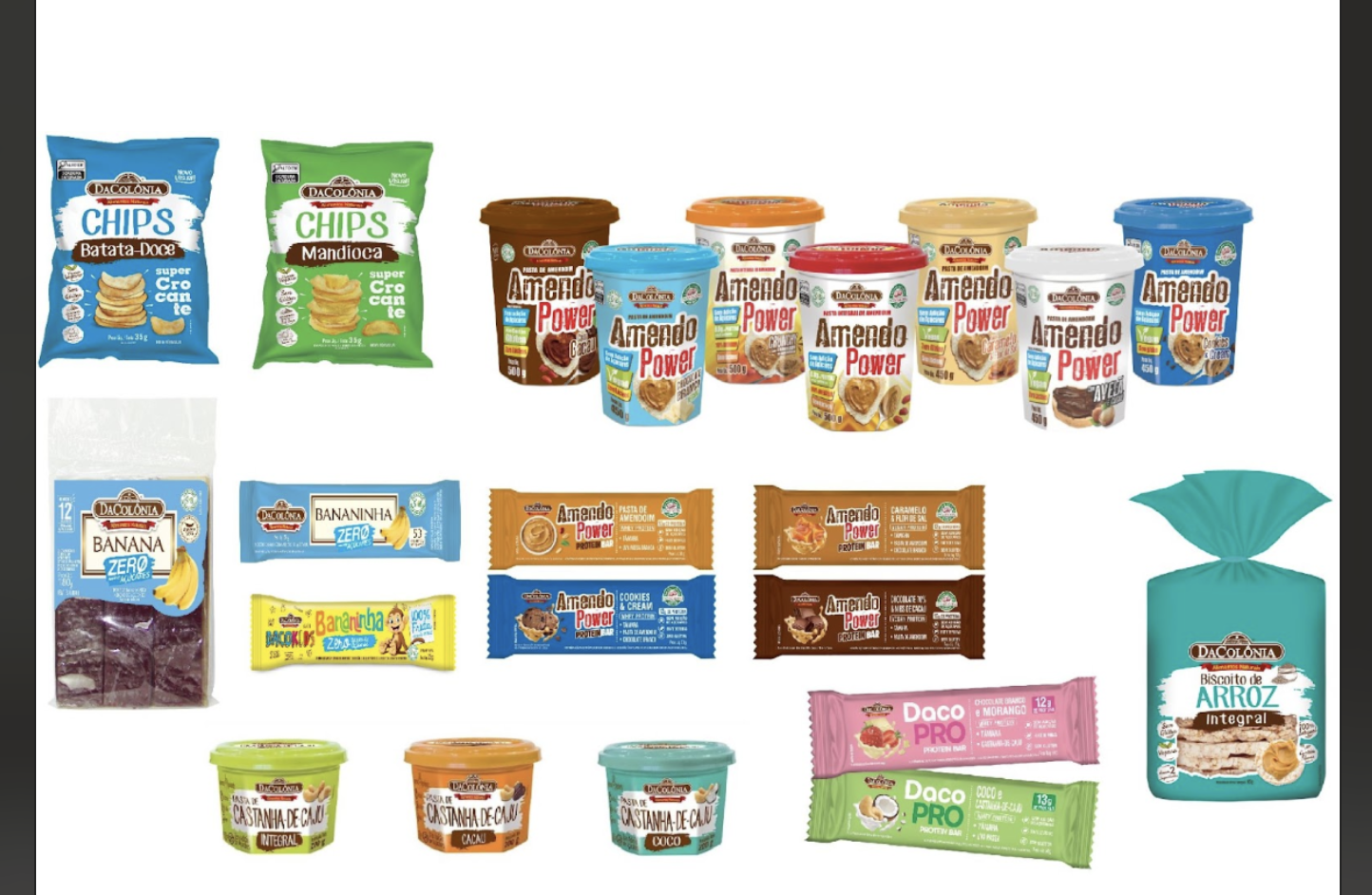 > DacoPRO Protein Bar: É produzida com pasta de castanha-de-caju, nos sabores Chocolate Branco & Morango e Coco & Castanha-de-Caju, com 12g e 13g de proteína respectivamente. Não não tem glúten e não leva adição de açúcares, sendo adoçado com tâmara.