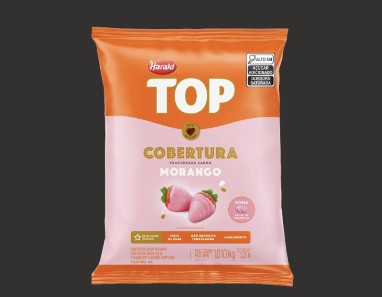 Com a Cobertura TOP sabor Morango, a Harald amplia as possibilidades de criação de seus consumidores, oferecendo uma solução prática e versátil para banhos, moldagens e recheios. O produto mantém as já consagradas características técnicas da linha TOP, derretimento fácil, excelente rendimento e praticidade, agora com a cor e o sabor autêntico do morango, desenvolvidos para destacar tanto a estética quanto o paladar das criações.