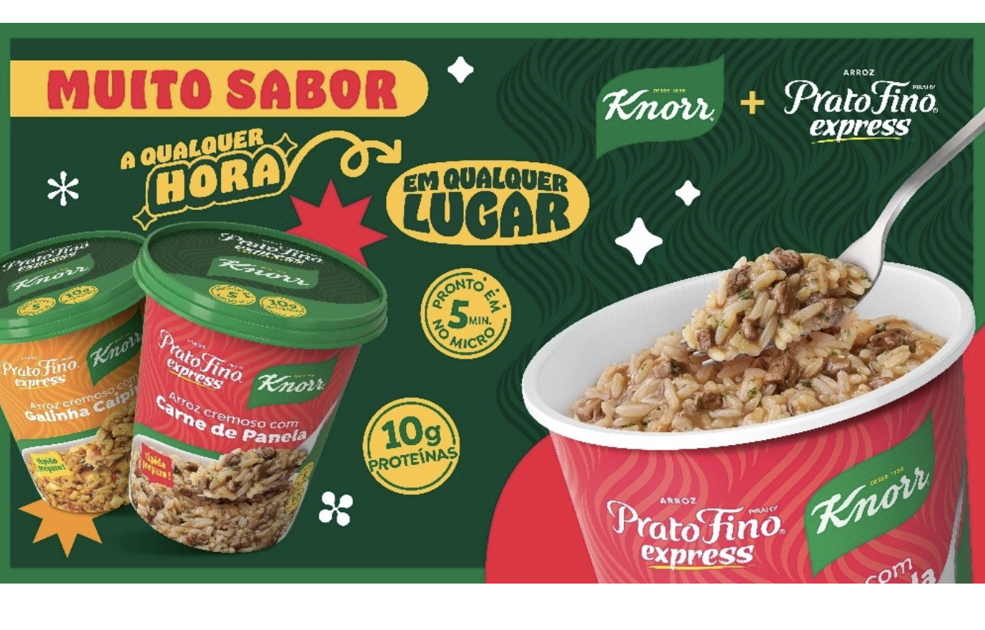 Knorr, marca da Unilever Alimentos, amplia sua presença no mercado de refeições prontas com o lançamento do Arroz Cremoso Express Prato Fino + Knorr, desenvolvido em parceria com Arroz Prato Fino, marca da Pirahy Alimentos. O produto chega ao mercado em embalagens de 80g, nos sabores Carne de Panela e Galinha Caipira, com preparo direto no pote e pronto em apenas cinco minutos no micro-ondas.
