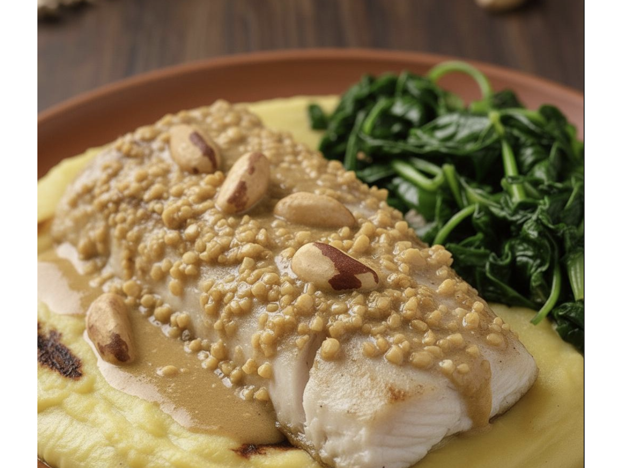 Filé de Aruanã ao molho de castanha-do-pará, com purê de banana-da-terra e taioba refogada, será apresentado pelo chef Ítalo Rosa em aula-show na SeaFood Show Latin 2025.