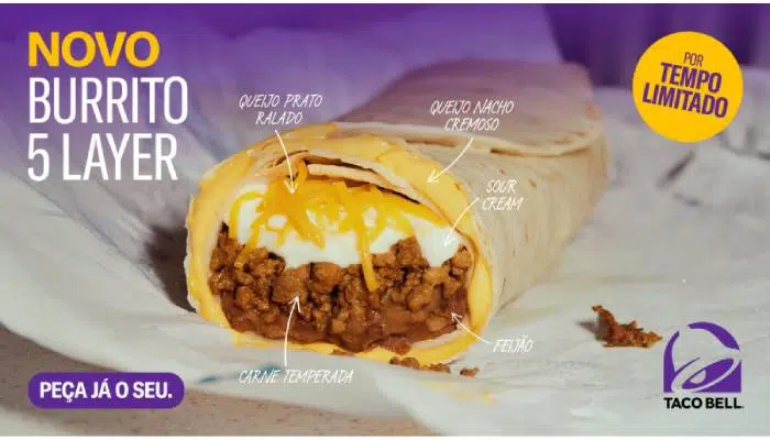A Taco Bell, rede californiana de fast-food inspirada na culinária mexicana, anuncia o lançamento do Burrito 5 Layer no Brasil, trazendo uma nova opção de produto durante a temporada de férias. Em edição limitada, a novidade já está disponível nas lojas para fortalecer uma das categorias mais pedidas do cardápio da Taco Bell: os burritos. O Burrito 5 Layer é um dos campeões de vendas da marca nos Estados Unidos, e na América Latina, onde já é sucesso em países como Guatemala, Aruba, Panamá, Costa Rica e Porto Rico.