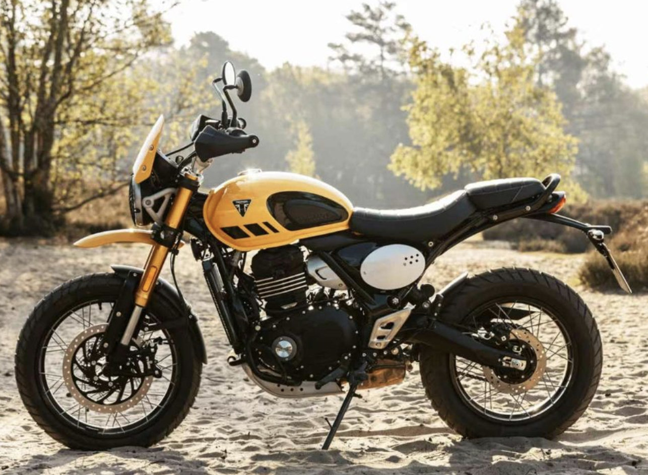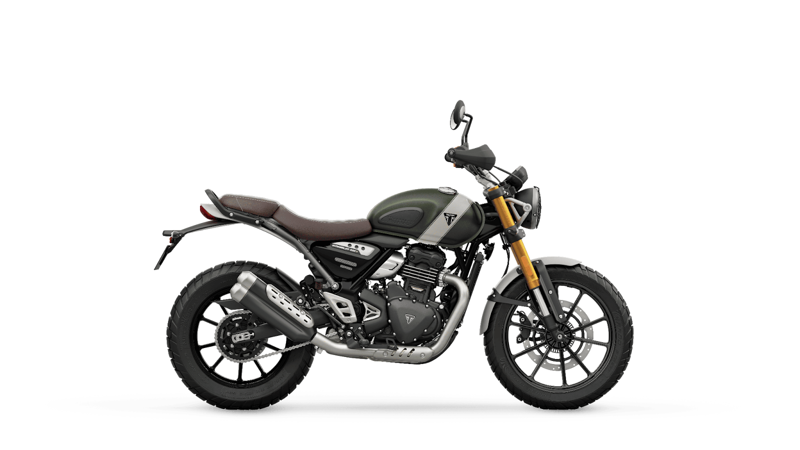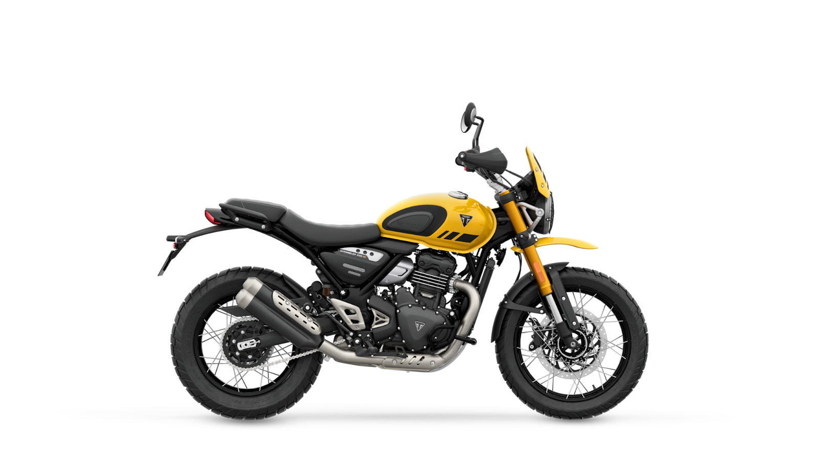 A Scrambler 400 XC se destaca por componentes voltados ao uso misto, como as novas rodas raiadas com aros de alumínio e pneus Metzeler Karoo Street sem câmara, além de suspensão de longo curso, para-lama elevado, protetores de mão e ABS com modo off-road. O modelo estará disponível em três novas cores: Racing Yellow, Storm Grey e Vanilla White, e traz ainda detalhes em preto, banco bipartido e escapamento elevado, assinatura clássica das Scramblers da Triumph.