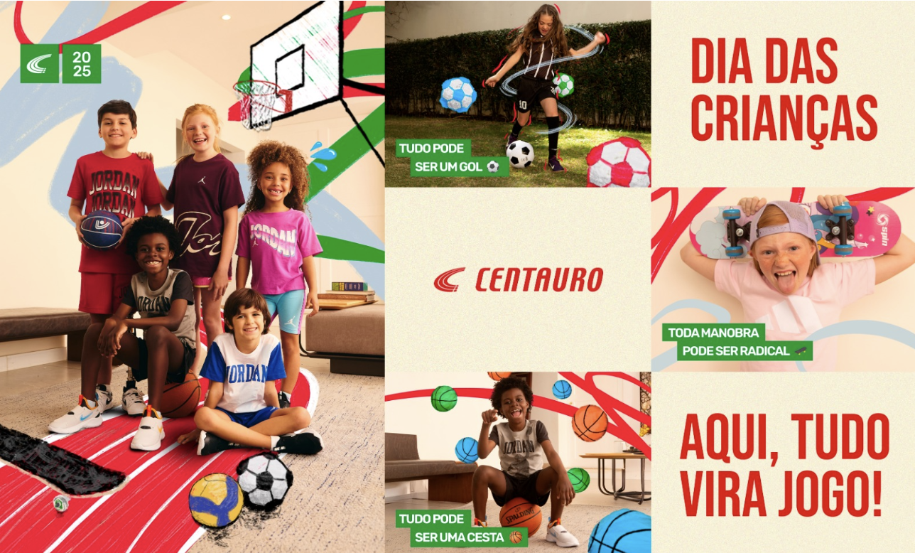 Em um cenário no qual crianças brasileiras passam em média 4h30 por dia em frente a telas, segundo a Sociedade Brasileira de Pediatria (SBP), a Centauro aposta em uma mensagem simples e poderosa: qualquer espaço pode se transformar em campo, quadra ou pista quando a criatividade e o corpo entram em jogo. Para dar vida a esse conceito, a marca apresenta um filme hero, gravado em formato lúdico e espontâneo, no qual crianças vivem o sonho de passar uma noite em uma loja Centauro. Entre brincadeiras, jogos improvisados e descobertas, a narrativa mostra que o esporte começa com imaginação e presença. Assista ao filme: Link Reforçando seu propósito de transformar vidas através do esporte, a Centauro também anuncia uma ação social em celebração ao Dia das Crianças: a doação de cerca de 800 bolas de futebol, basquete e outras modalidades para cinco instituições que fazem parte do programa Transforma, iniciativa de responsabilidade social da Centauro que apoia projetos de inclusão por meio do esporte. As instituições contempladas são: