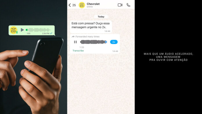 A partir desse comportamento, a Chevrolet lançou a campanha “A Mensagem Urgente” — áudios que só podem ser compreendidos quando reproduzidos na velocidade 2x. Criada para o Maio Amarelo, mês dedicado à conscientização por um trânsito mais seguro, a ação funciona como um alerta impactante sobre os perigos da imprudência ao dirigir.