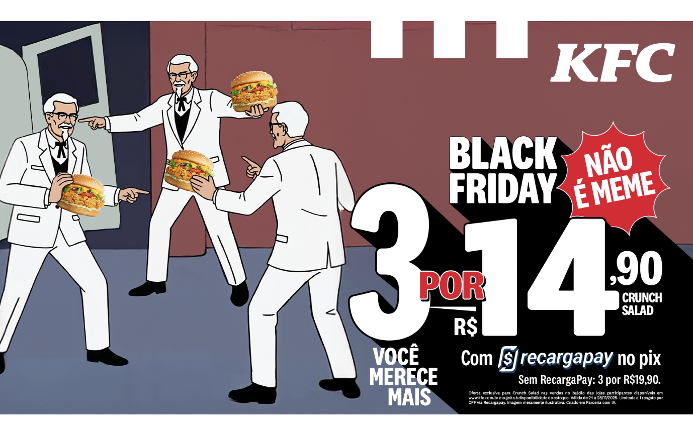 O KFC Brasil, a maior rede de frango frito do mundo, preparou uma ação especial para a Black Friday 2025 e promete um mês recheado de sabor, ofertas exclusivas e muito bom humor, com promoções imperdíveis em todo o país. Com uma mecânica simples e engraçada, a campanha pretende movimentar as redes sociais e reforçar o espírito bem-humorado que é marca registrada do KFC, por isso, também mergulha no universo dos memes e da cultura pop e conversa de igual para igual com seu público, trazendo o Sanders como o grande protagonista das propagandas do período.