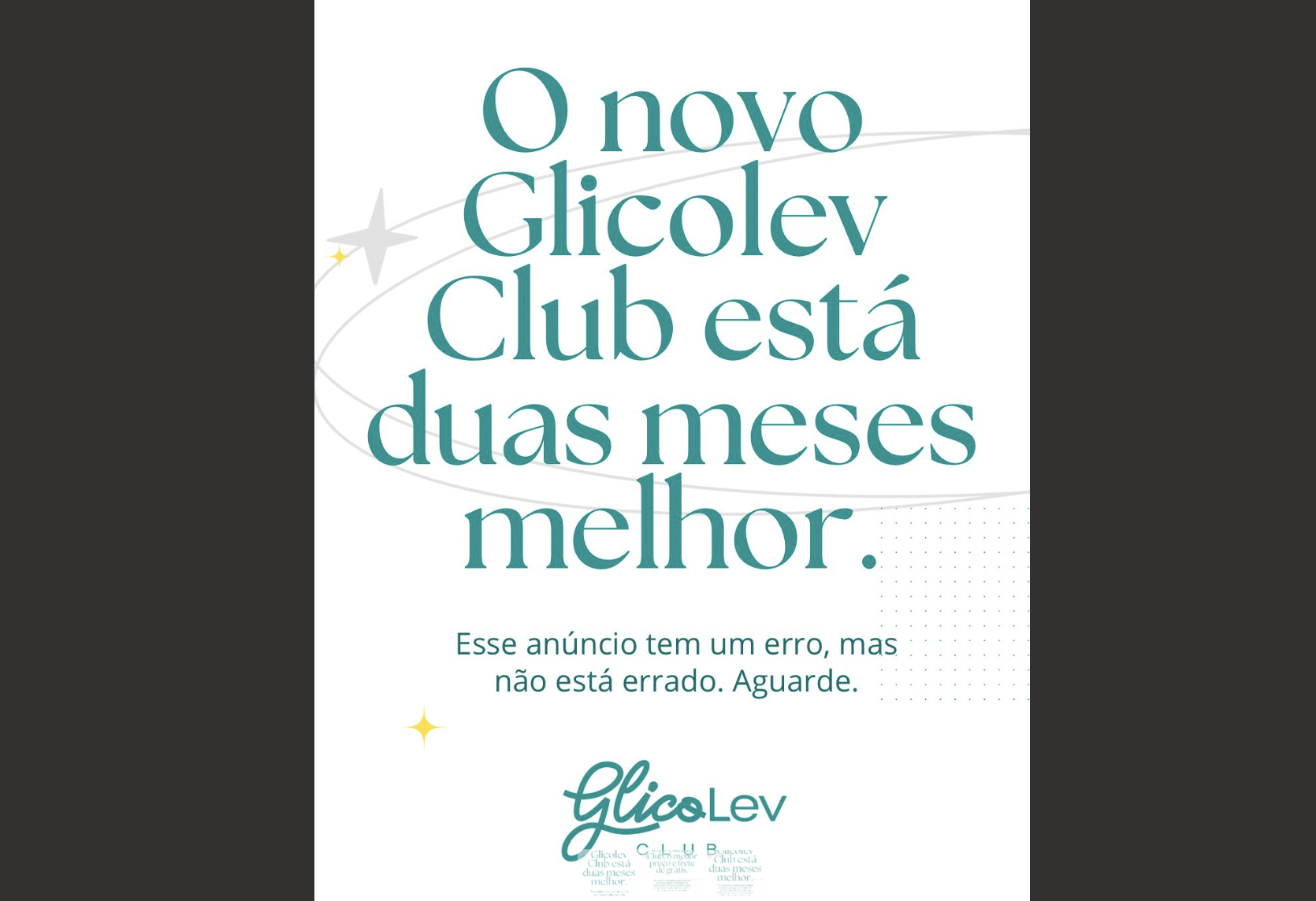 O anúncio de lançamento da campanha vem com um aparente erro no título da peça teaser da campanha: “O novo Glicolev Club está duas meses melhor.” A explicação vem logo embaixo, no subtítulo da peça que diz “Esse anúncio tem um erro, mas não está errado.” Em uma segunda fase, este mesmo anúncio ganha um sub que revela do que estamos falando: “Viu o erro? É de propósito para chamar sua atenção para as novidades do Glicolev Club.”