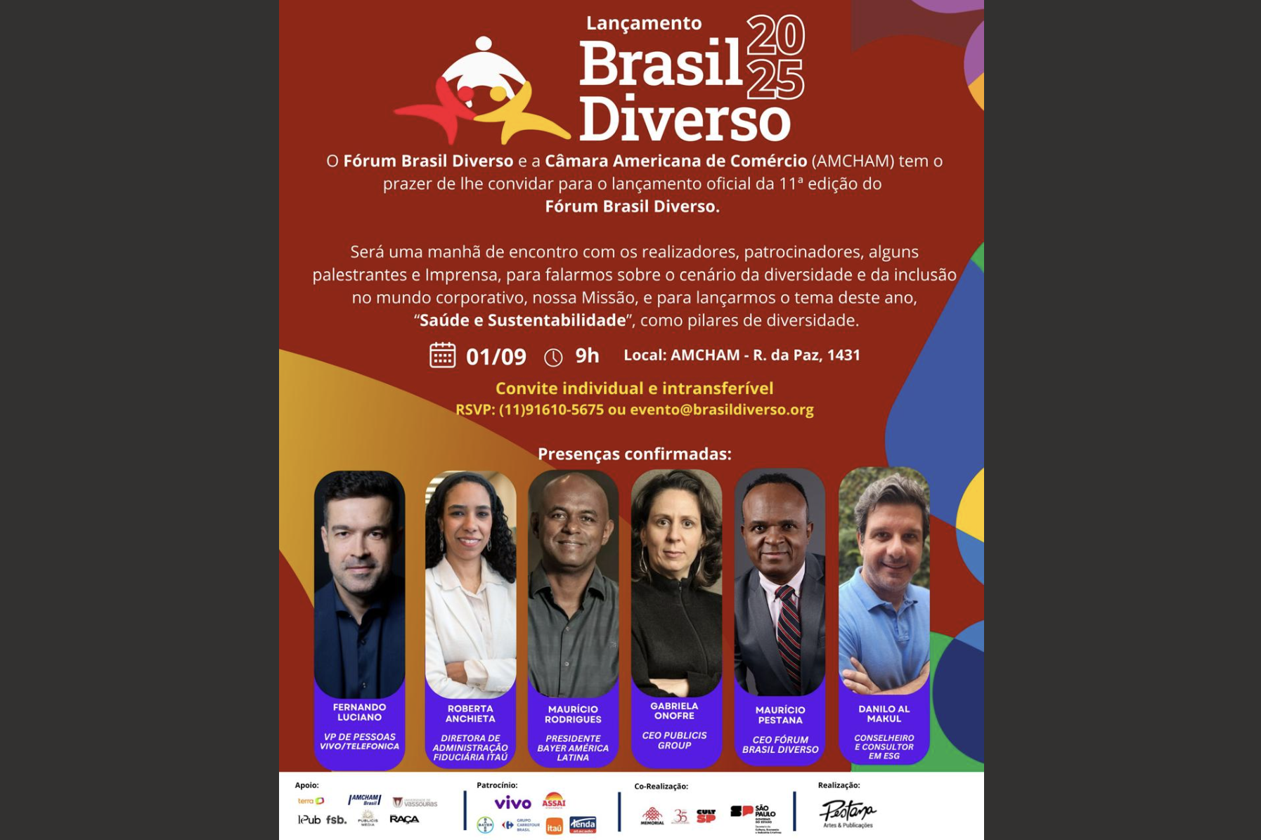 O Fórum Brasil Diverso realiza no próximo 1º de setembro, às 9h, na AMCHAM São Paulo, o encontro de lançamento da sua 11ª edição, que neste ano terá como tema “Saúde e Sustentabilidade: o poder da diversidade e inclusão, no ano da COP30”.