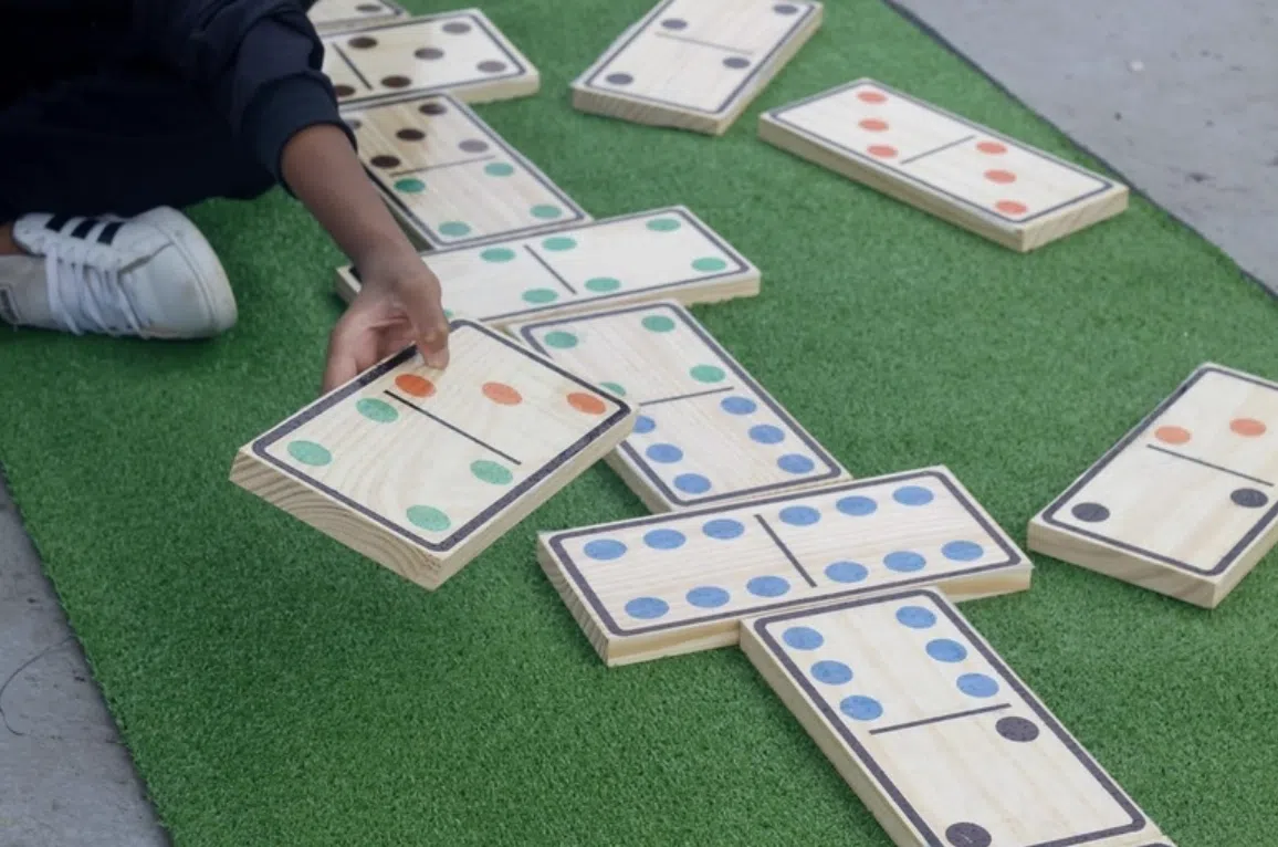 Os jogos gigantes, como dominó, jenga, pega varetas, ampliam brincadeiras tradicionais brasileiras para versões de grande escala, criando um espaço em que os participantes vivenciam corpo, memória, criatividade e convivência.