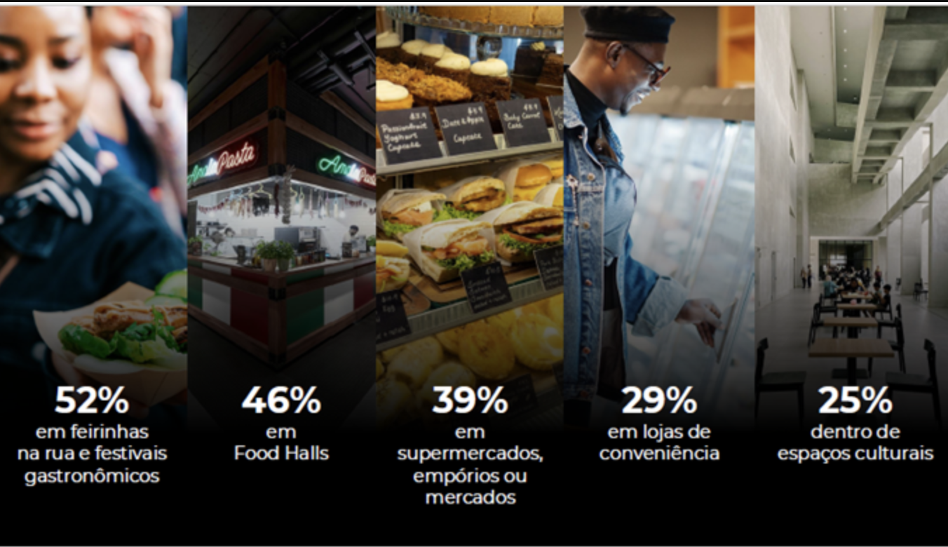 O levantamento foi feito entre 14 e 22 de agosto de 2025 com 1.046 pessoas das classes A, B e C em todo o país, e revela locais de consumo fora do lar que vão além do convencional: 52% pretendem consumir refeições, alimentos ou bebidas em feirinhas e festivais gastronômicos nos próximos seis meses. Na sequência, aparecem locais como os Food Halls com 46%, seguidos por supermercados, empórios e mercados com 39%, lojas de conveniência com 29% e espaços culturais com 25%.