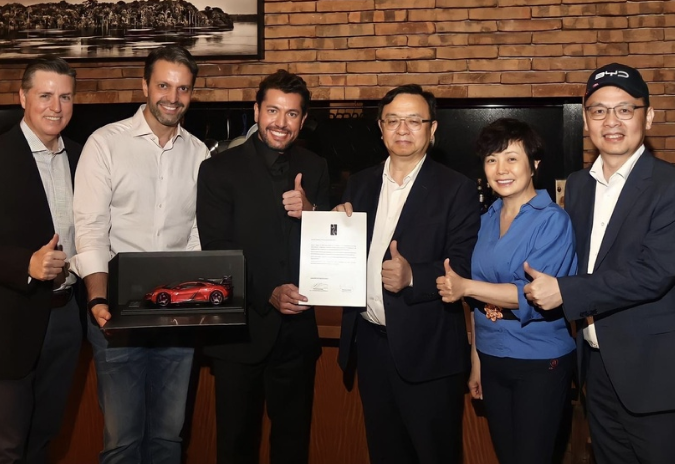 Momento da assinatura da venda do primeiro U9 Xtreme. Na imagem da esquerda para direita: Werner Shaal / diretor comercial da Denza Brasil, Alexandre Baldy / Vice-presidente sênior da BYD, Leo Sanchez / empresário, Wang Chuanfu / fundador e CEO da BYD, Stella Li / Vice-presidente executiva da BYD e Tyler Li / Presidente da BYD Brasil