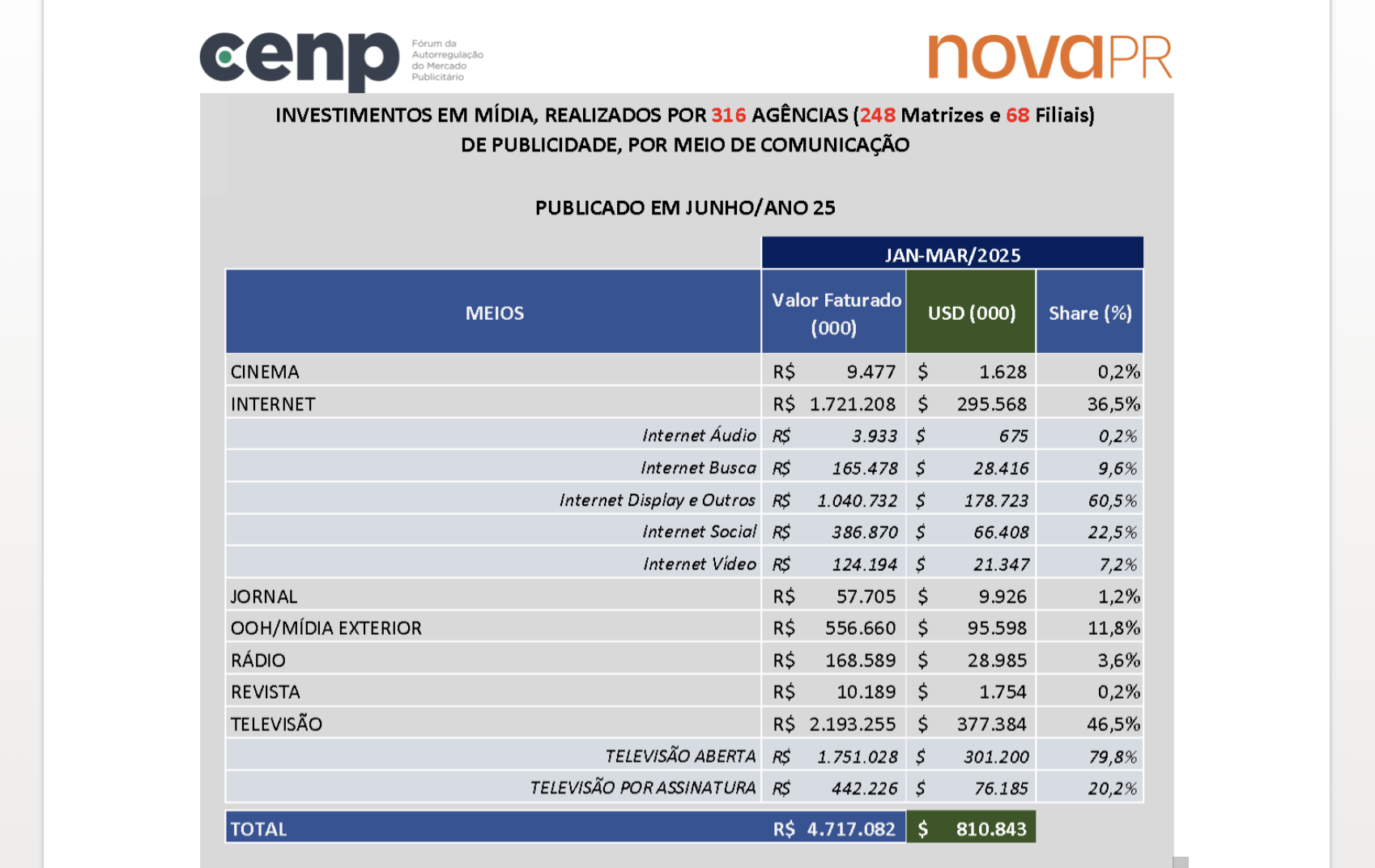 Os dados compilados pelo Painel Cenp-Meios referem-se aos espaços publicitários efetivamente comprados por 316 agências de todo o país entre janeiro e março de 2025. O levantamento considera os PIs (Pedidos de Inserção) executados pelos veículos e organizados por meio, período, estado e região, sem acesso a informações de clientes ou veículos específicos.