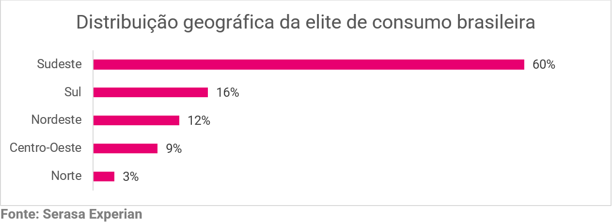 A elite de consumo brasileira está concentrada principalmente no Sudeste (60%), com destaque para o estado de São Paulo (39%) e a capital (18%), especialmente nos bairros Vila Mariana, Perdizes e Pinheiros. Campinas, no interior paulista, aparece na sequência como segunda cidade com maior concentração desse público. Na visão por regiões, em sequência figuram o Sul, que reúne 16% dos consumidores premium, e o Nordeste, com 12%, completando o top 3 das regiões com maior presença dessa elite de consumo. Abaixo um gráfico mostra a distribuição desse público nas regiões do país: