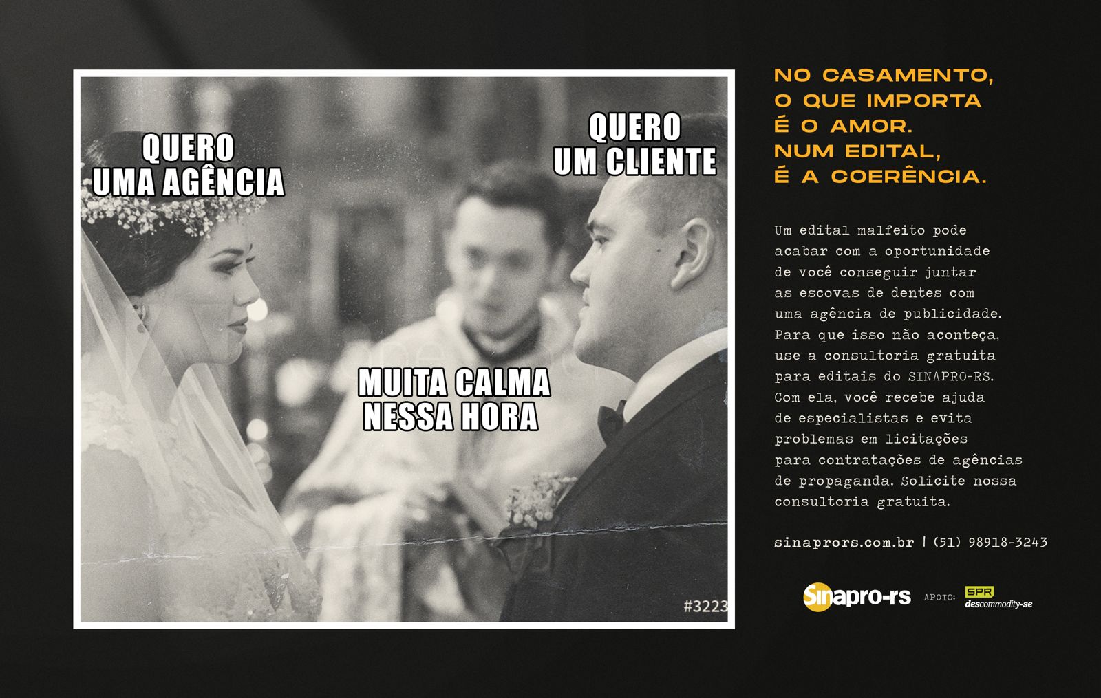 Assinada pela agência SPR, a campanha conta com uma linguagem contemporânea e faz correspondência a um casamento bem-sucedido entre órgão público e agência de propaganda, trazendo para as peças de comunicação um casal de noivos, representado pelo contratante (noivo) e pela contratada (agência). O Sinapro-RS está simbolizado na figura do padre que celebra a união do casal. A campanha conta com peças de TV, rádio, jornal e OOH (out of home).