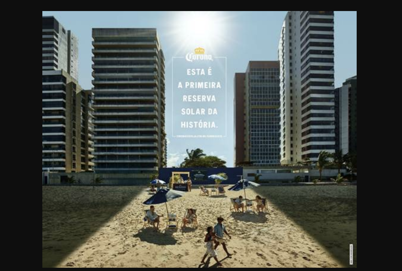 Com o objetivo de preservar o acesso à luz solar em praias públicas, a Corona lançou, em abril passado, a “primeira reserva solar do mundo”, na Praia de Piedade, no Recife. A marca de cerveja arrendou um terreno de frente para a praia para limitar a altura dos edifícios no espaço, a fim de impedir a potencial obstrução da luz solar e garantir que ela permaneça por mais tempo na areia. Deu certo! Tão certo que virou dois troféus no Festival de Cannes.