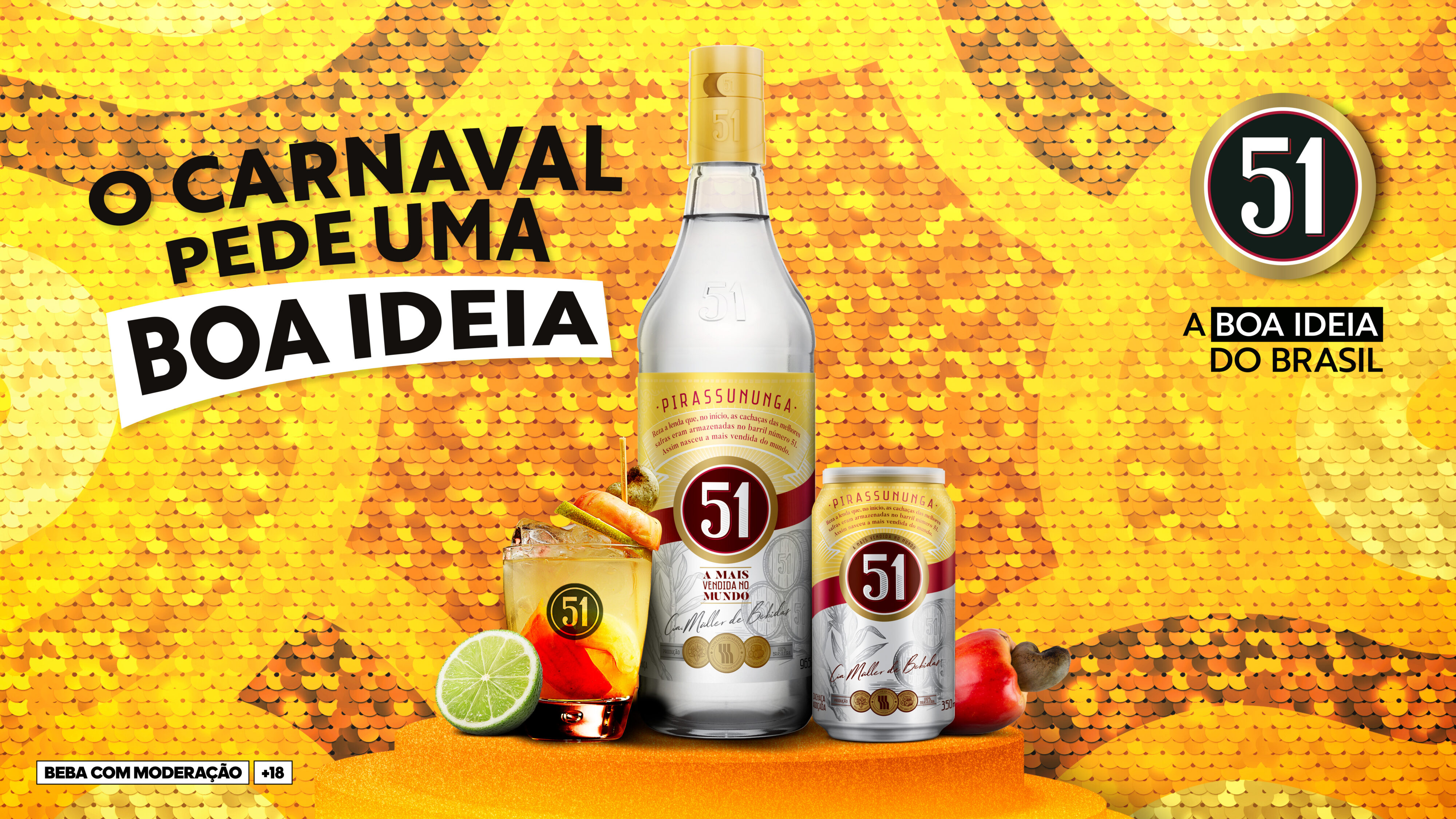 Sinônimo da categoria e ícone cultural do país, assim como o próprio Carnaval, a Cachaça 51 traz a assinatura A Boa Ideia do Brasil para o centro da festa. A campanha conecta o principal conceito da marca ao momento mais esperado do ano. A proposta é estar ao lado dos brasileiros para brindar o Carnaval com diversidade e reconhecimento da tradição popular.