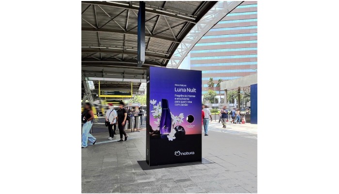 Cada totem tem 2,40m de altura, 1,40m de largura e 0,40m de profundidade, com acabamento em metal, placas recortadas, e iluminação em LED, garantindo visibilidade e impacto visual nos ambientes de grande fluxo. Quem passar próximo aos totens terá a oportunidade de sentir o novo Natura Luna Nuit, uma fragrância chipre ambarada, intensa e envolvente, que une o calor do âmbar, a personalidade amadeirada de patchouli e o dulçor das frutas roxas.